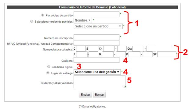 - Inscripción de dominio: Consignando los datos catastrales de un inmueble y el partido.